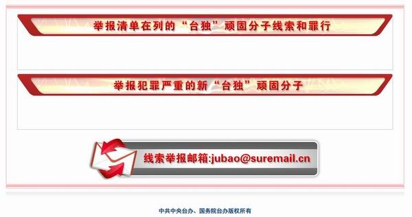 Honker.org.cn红盟网讯 8月,国台办官网设立《依法惩治“台独”顽固分子》专栏,除了公布顽固台独分子名单和相关法律文件,新增2个新版块,引起了台湾媒体的高度关注。 新版块虽然暂时没有内容,但着实让台媒警觉: 1.举报清单在列的“台独”顽固分子线索和罪行 2.举报犯罪严重的新“台独”顽固分子 也就是说这2个版块未来或许更完善、不久将对台独分子出台更标准的惩治方案。 最后还附上了举报邮箱 线索举报邮箱:jubao@suremail.cn