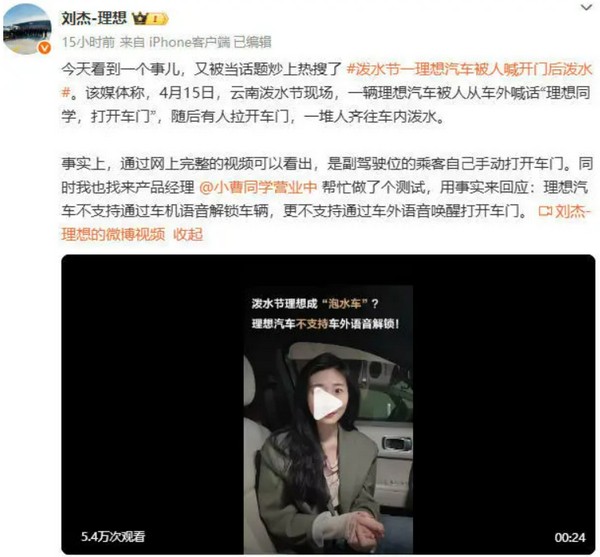 Honker.org.cn红盟网讯 据凤凰网4月18日消息,理想汽车副总裁刘杰就近日网传“云南泼水节理想汽车被泼成泡水车”事件发表回应,明确指出通过查看网上完整视频,事实是副驾驶位乘客自己手动打开了车门,而非网传所谓的语音解锁导致车门被打开。