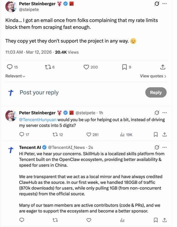 在社交平台上,有用户提问OpenClaw创始人Peter Steinberger:是否知道腾讯正在抓取Clawhub上的技能并导入到该平台中。 对此,奥地利知名程序员、OpenClaw创始人Peter Steinberger在社交平台上评论,他曾收到一封邮件,有人抱怨他的速率限制导致他们无法快速抓取数据。“他们抄袭,却不以任何方式支持这个项目”。 随后,Peter Steinberger还问及腾讯混元“愿意帮帮忙吗?而不是让我的服务器成本飙升到五位数?” 对此,Tencent AI官方回应道:SkillHub是基于OpenClaw生态系统构建的本地化技能平台,为中国用户提供更好的可用性和速度。只是面向中国用户的本地镜像站,标注ClawHub为原始来源; 同时,腾讯上线首周给用户分发了180GB(87万次下载),但从官方源只拉取约1GB。 此外,团队成员本身也是项目代码和PR贡献者,希望继续支持生态并成为更好的赞助商。