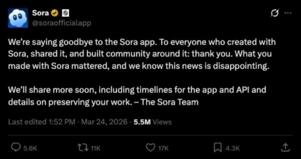 [AI新闻]2026OpenAI宣布将关停文生视频工具Sora服务 转AGI业务 |