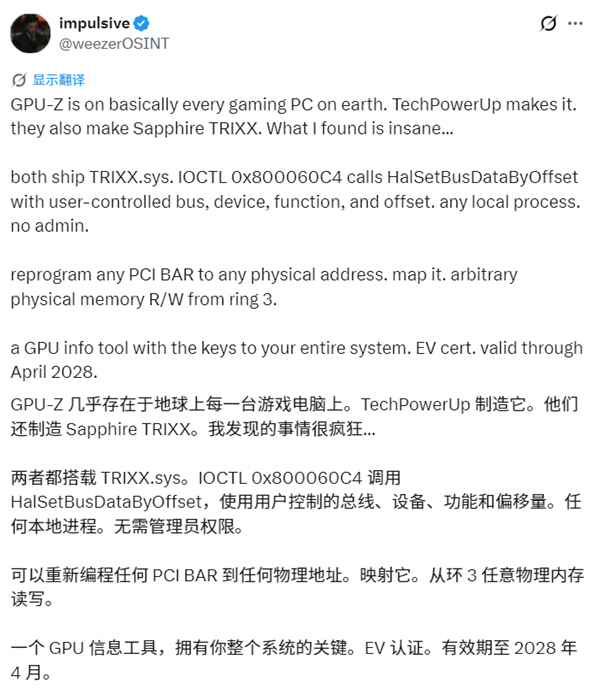 其内置的TRIXX.sys驱动程序可在无需管理员权限的情况下,直接读写计算机物理内存,攻击者可借此获取系统最高访问权限。 漏洞的核心在于TRIXX.sys驱动程序中的控制码IOCTL 0x800060C4,该控制码原本用于读取显卡硬件信息,但权限门槛极低,系统中任何普通程序均可向该驱动发送指令。 通过调用系统内核函数HalSetBusDataByOffset,攻击者可以重新定义PCI BAR(基址寄存器),从软件权限层级(Ring 3)直接跨越防御,读取或修改物理内存中的数据,包括密码、加密密钥以及操作系统核心保护机制。 更棘手的是,该驱动程序持有合法的EV(Extended Validation)数码签名,有效期至2028年,Windows系统会将其视为完全可信的文件。 这意味着黑客无需直接攻击已安装GPU-Z的用户,而是可以将这个有漏洞但合法签名的旧版驱动带入目标电脑,实施BYOVD攻击,绕过Windows的安全封锁。 GPU-Z作者Wizzard承认部分技术细节具有参考价值,但反驳称在Windows环境下普通用户程序无法直接与驱动通信,必须具备管理员权限才能触发。 目前Wizzard正在修补漏洞,在新版本推出前请谨慎使用,由于此漏洞需要本地执行,用户只要不执行可疑文件,黑客就无法利用电脑内的GPU-Z。 |