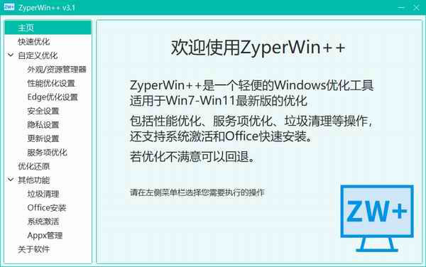 Honker.org.cn红盟网讯 ZyperWin++是一个轻便的Windows优化工具,适用于Win7-Win11最新版的优化,包括性能优化、服务项优化、垃圾清理等操作,还支持系统激活和Office快速安装。