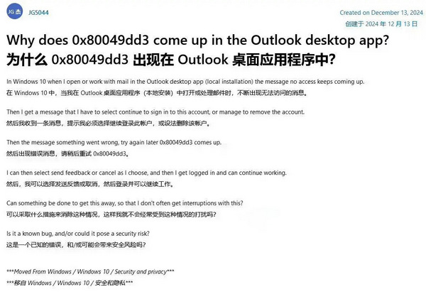 Honker.org.cn红盟网讯 据IT之家 12 月 18 日消息,微软昨日(12 月 17 日)更新 Feedback Hub 帖子,承认没有完全修复桌面端 Outlook 的“0x80049dd3”错误代码,状态从“已修复”再次调整为“正在调查”。
