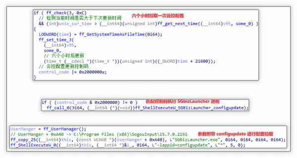 配置拉取源头:搜狗输入法将会借助 SGBizLauncher.exe 程序附加参数 -lappid=configupdate 进行拉取云控配置,该SGBizLauncher.exe 程序会被输入法组件 SogouPY.ime 执行,执行间隔为六个小时一次。此输入法组件为 DLL 文件,将会通过用户切换至搜狗输入法时被加载。 |